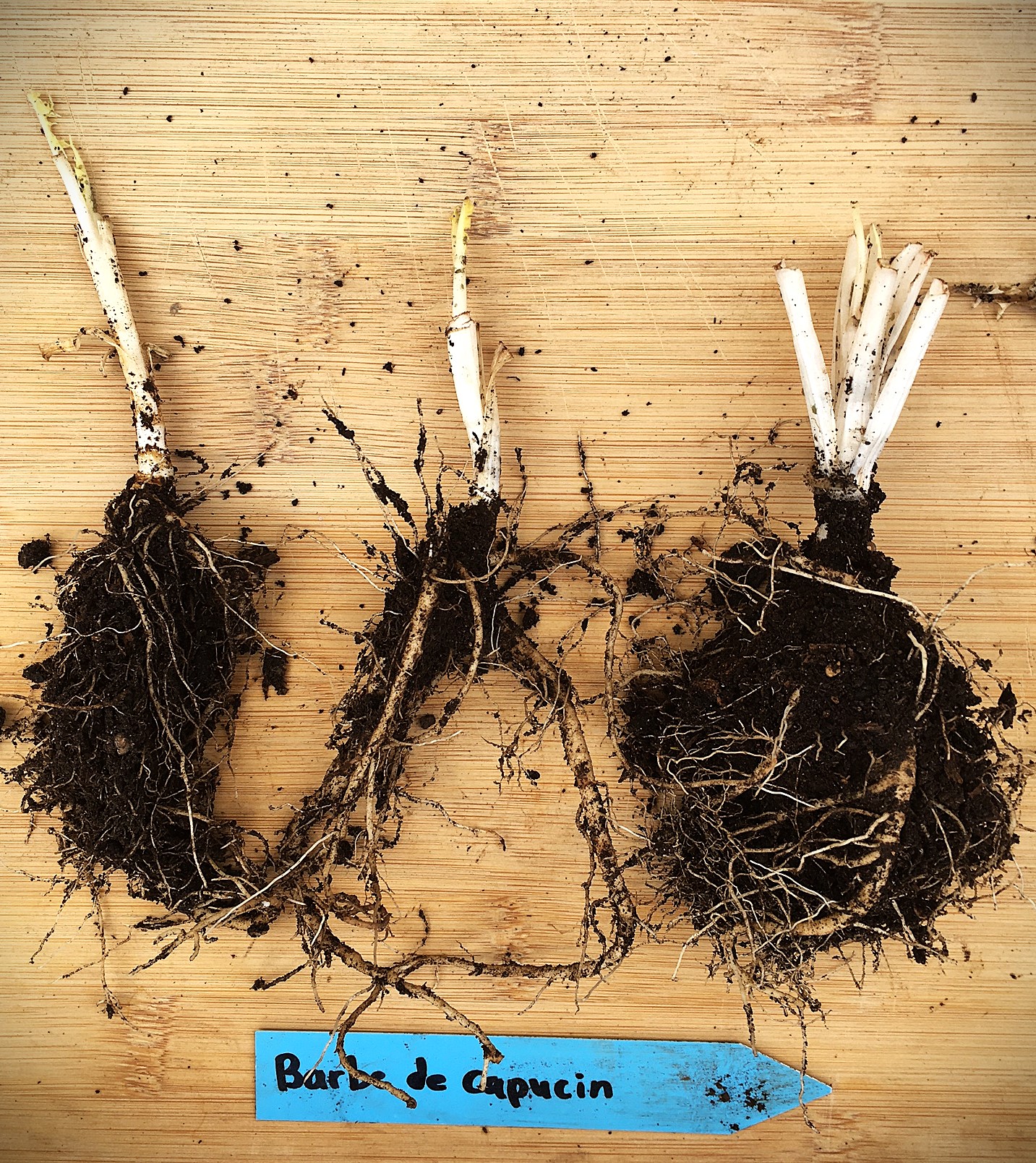 La barbe de capucin est une chicorée délicieuse (photo de droite) que nous avons cultivée en 2024 et dont nous replanterons les racines (photo ci-dessus au centre) cette année. Il aura donc fallu deux saisons pour produire les précieuses semences de cette variété oubliée…